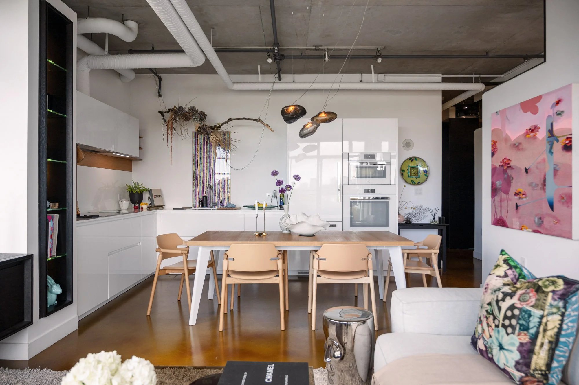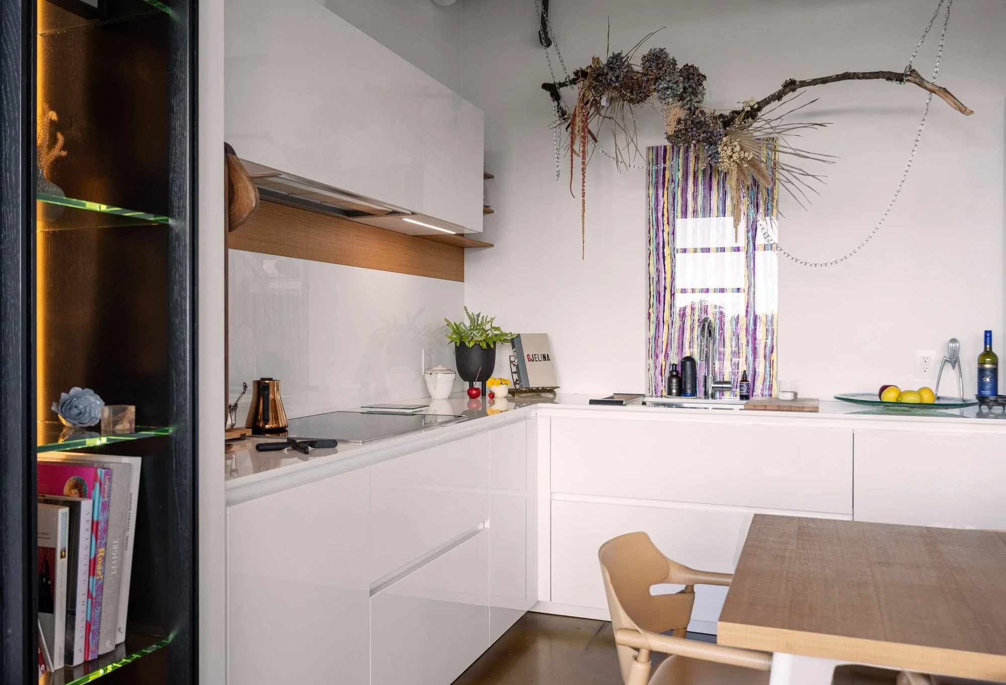 Fay’s home is a creative laboratory, where her passion for design takes shape through continuous experimentation. Unique art pieces and furniture, collected throughout her life and travels, reflect her evolving aesthetic and personal journey. The raw concrete backdrop and soaring ceilings contrast with the warmth of Yakisugi-style wood, which outlines the architectural details, creating a striking interplay against the crisp white walls and lacquered kitchen cabinetry.