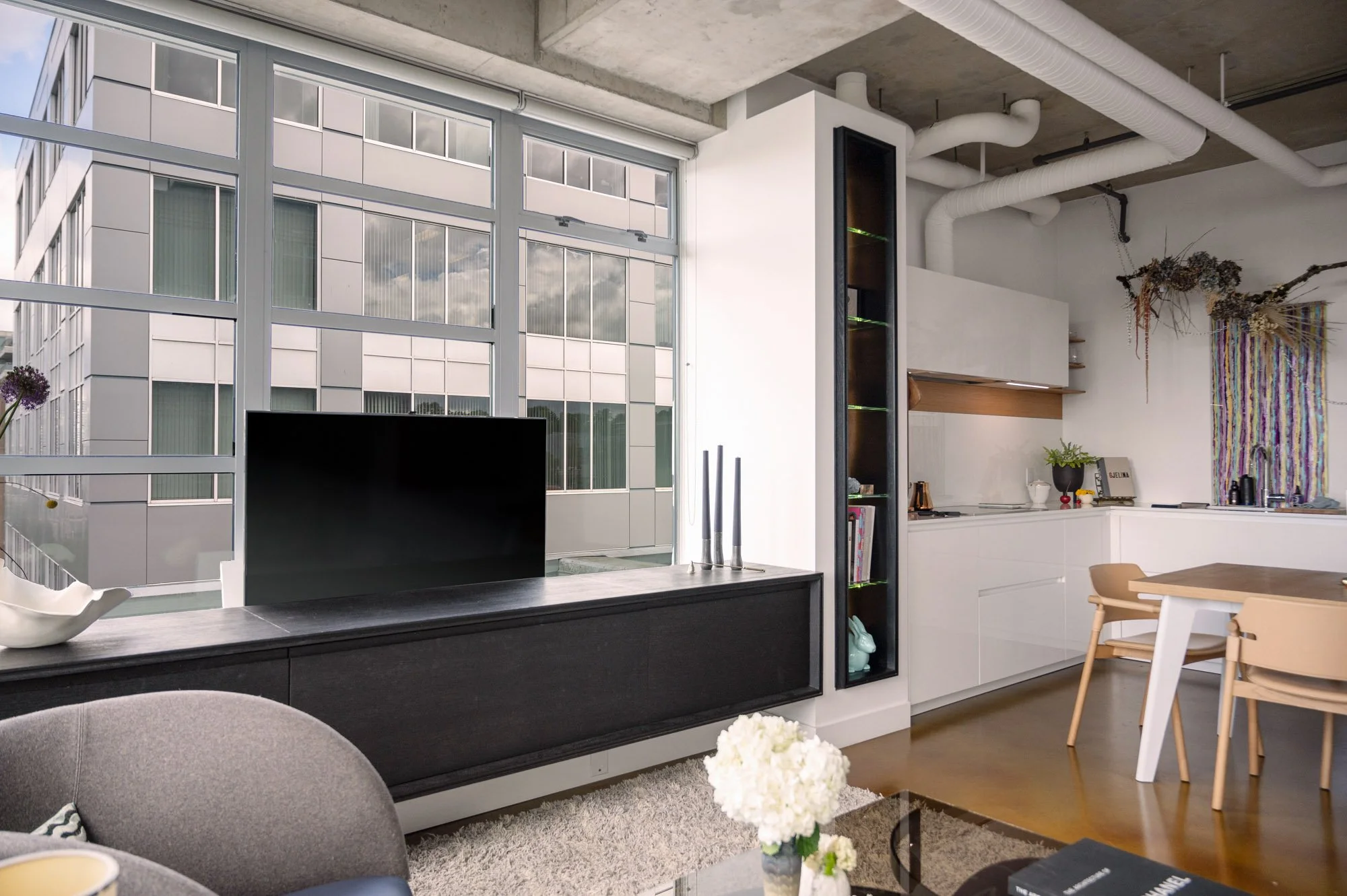 Framed by expansive glass walls and sliding doors, the full sweep of Vancouver is always in view, merging urban life with Fay’s distinct style. Her home is a dynamic reflection of her creativity, constantly evolving with time.
