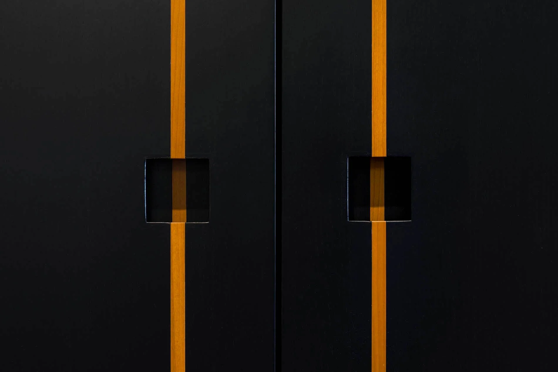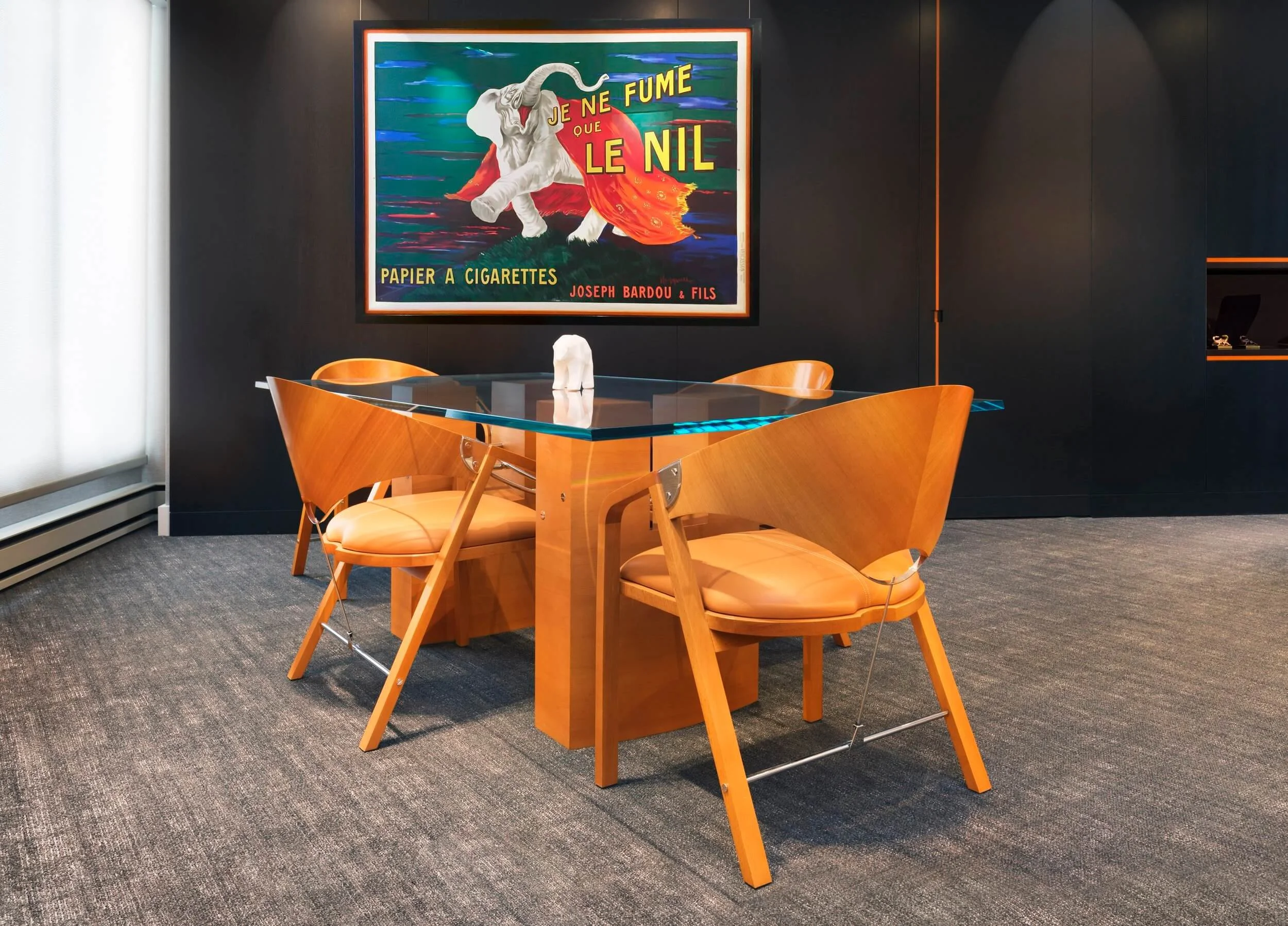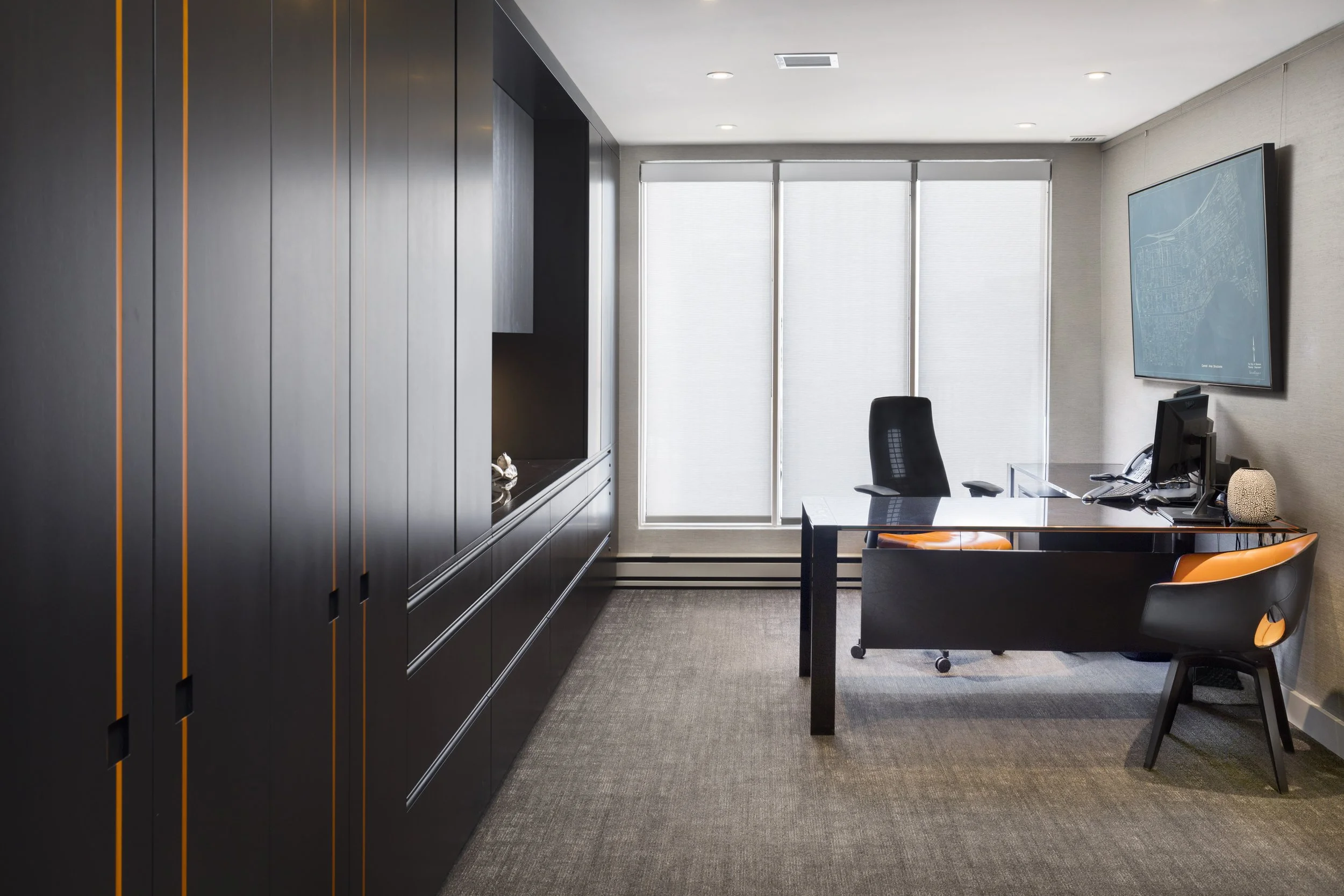 An homage to the client’s love for cars, the design for the millwork cabinetry and typical office desk adorn racing stripes in the striking colour of orange, against materials of dark wood and glass.