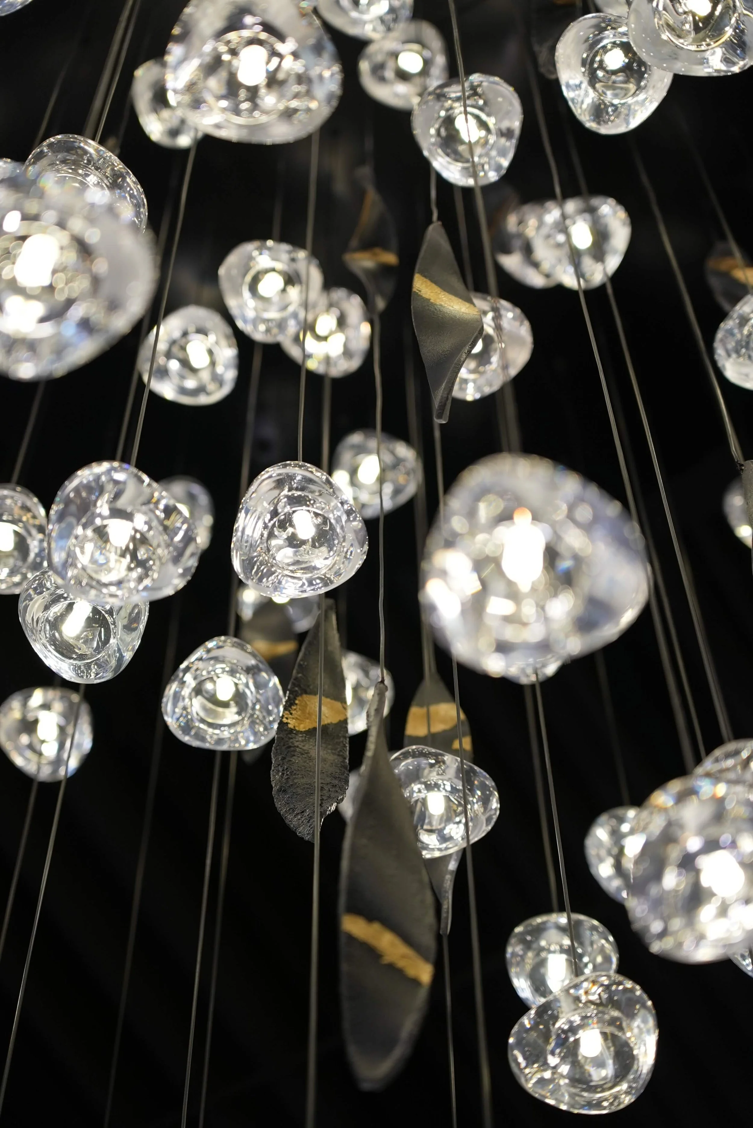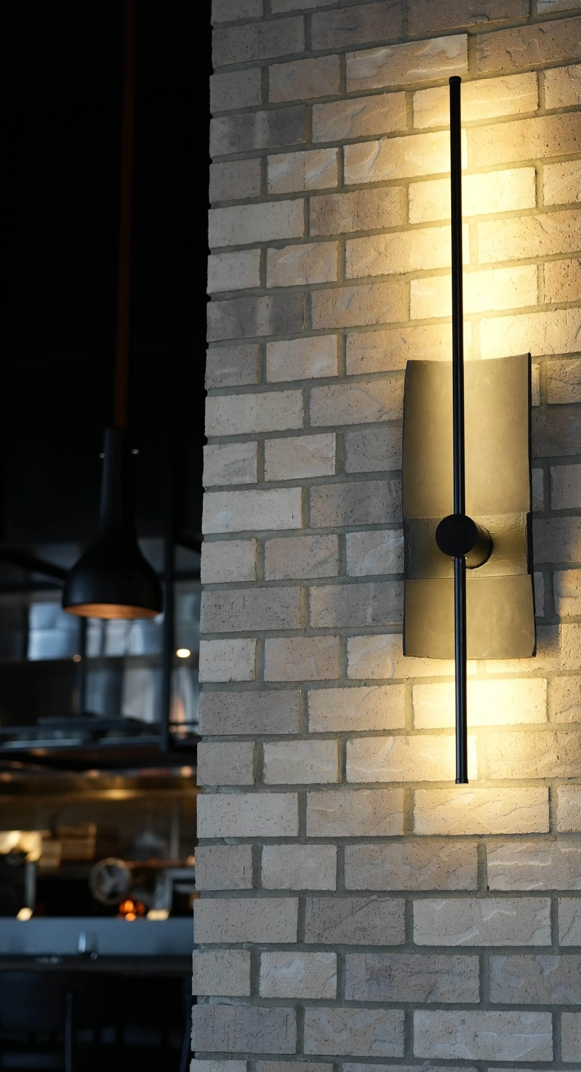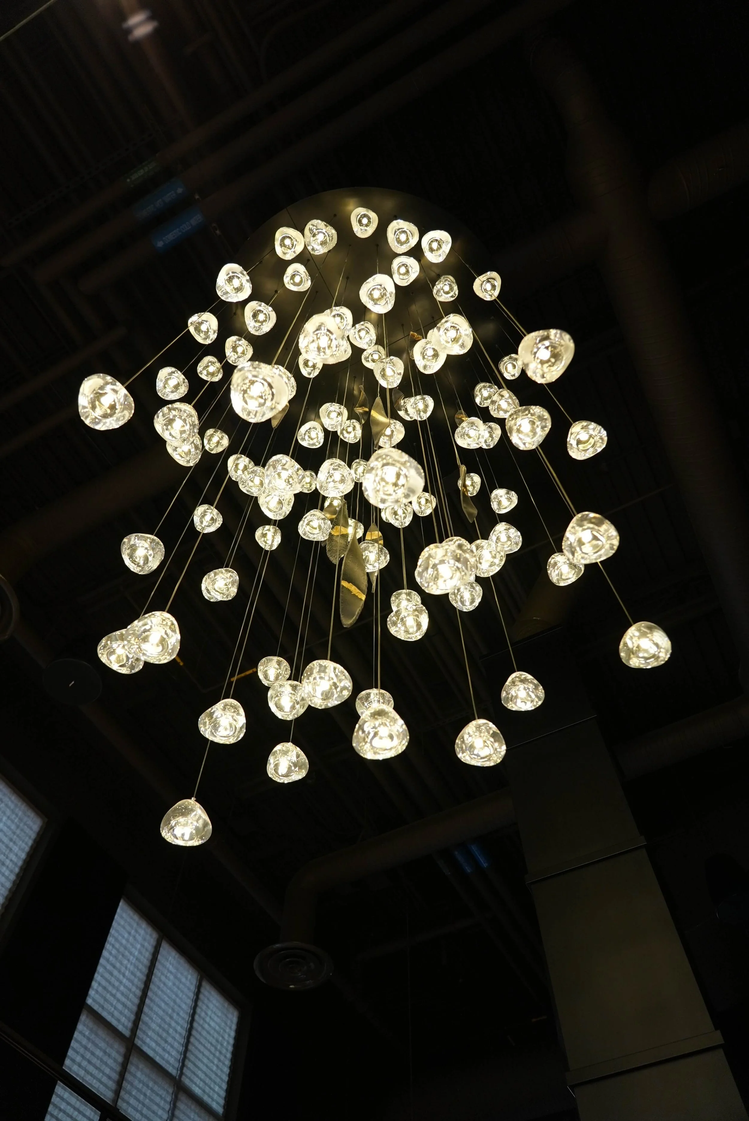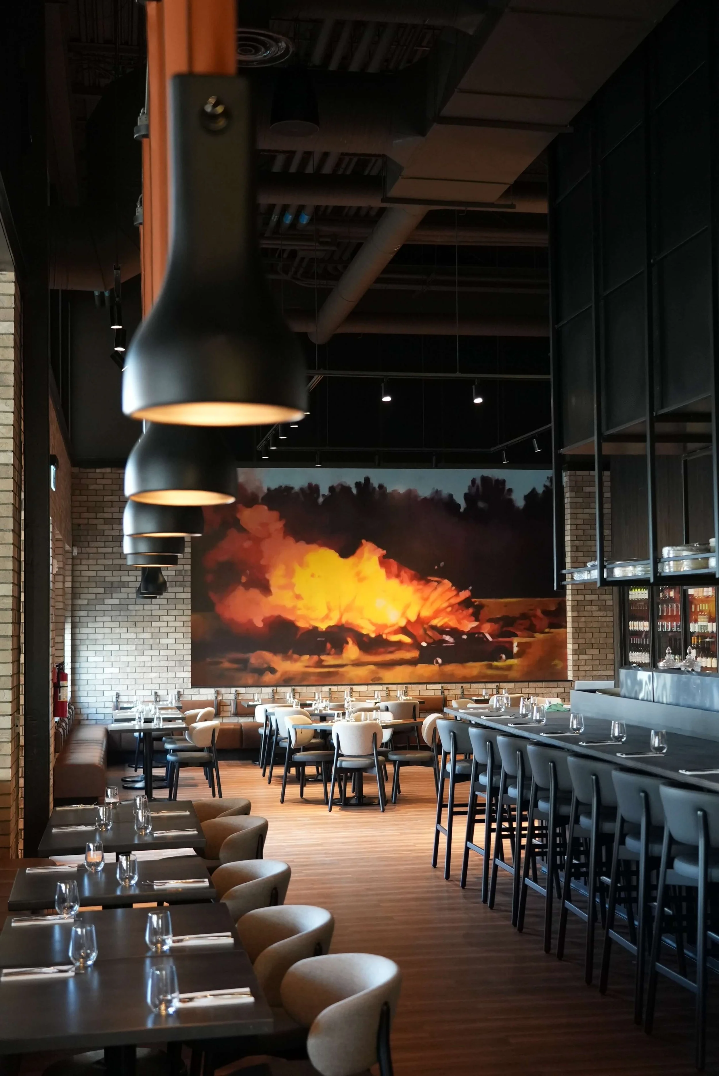 Pyro meets FIRE and pays homage to the primal roots of cooking over wood fires. The light fixtures reflect this with individually hand-pressed black clay tiles featured in three different styles of custom-designed fixtures. The black cauldron fixtures hang from cognac-colored leather straps centered over each table, evoking the experience of comfortably gathering around a wood fire cauldron to enjoy food and beverages.