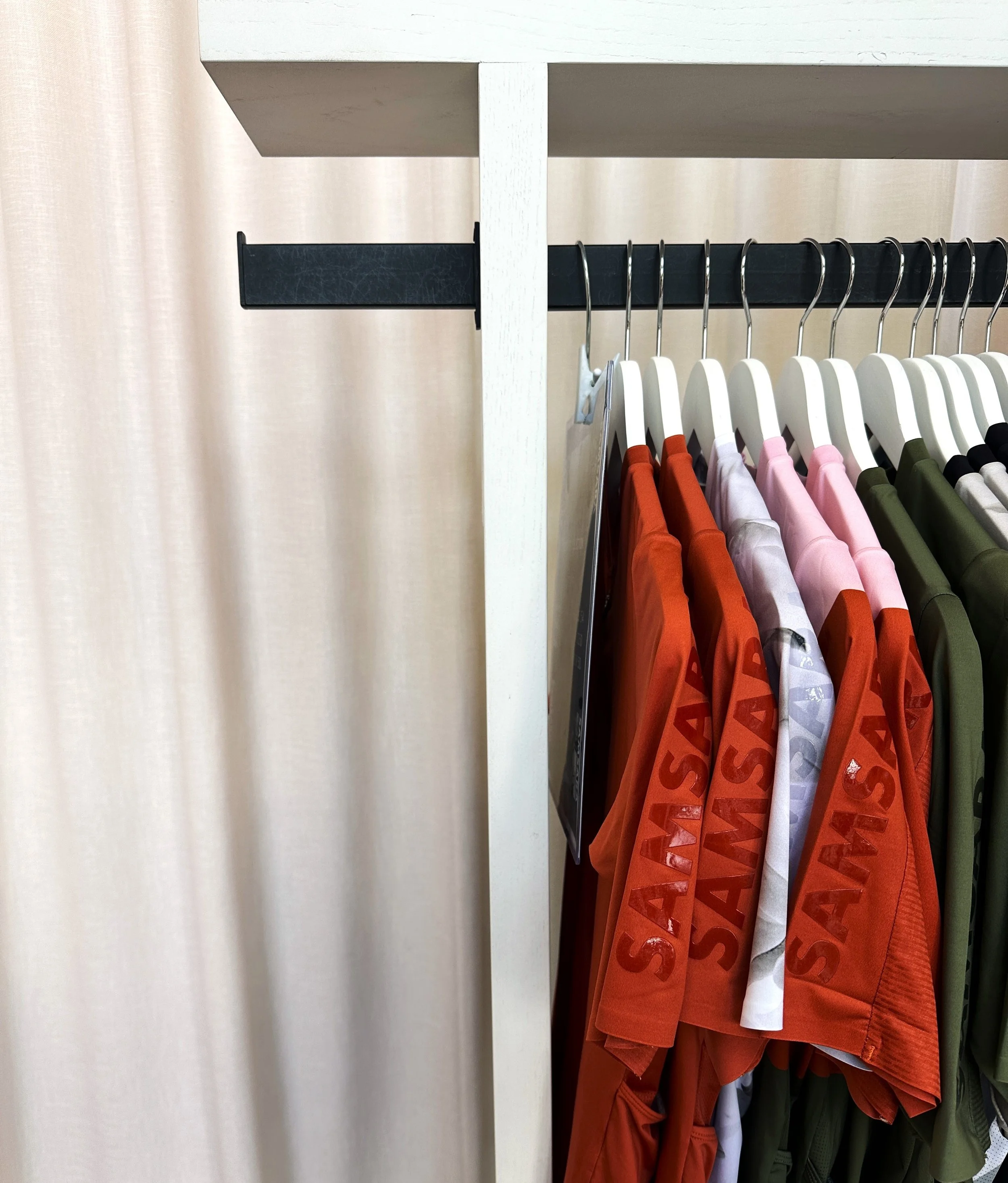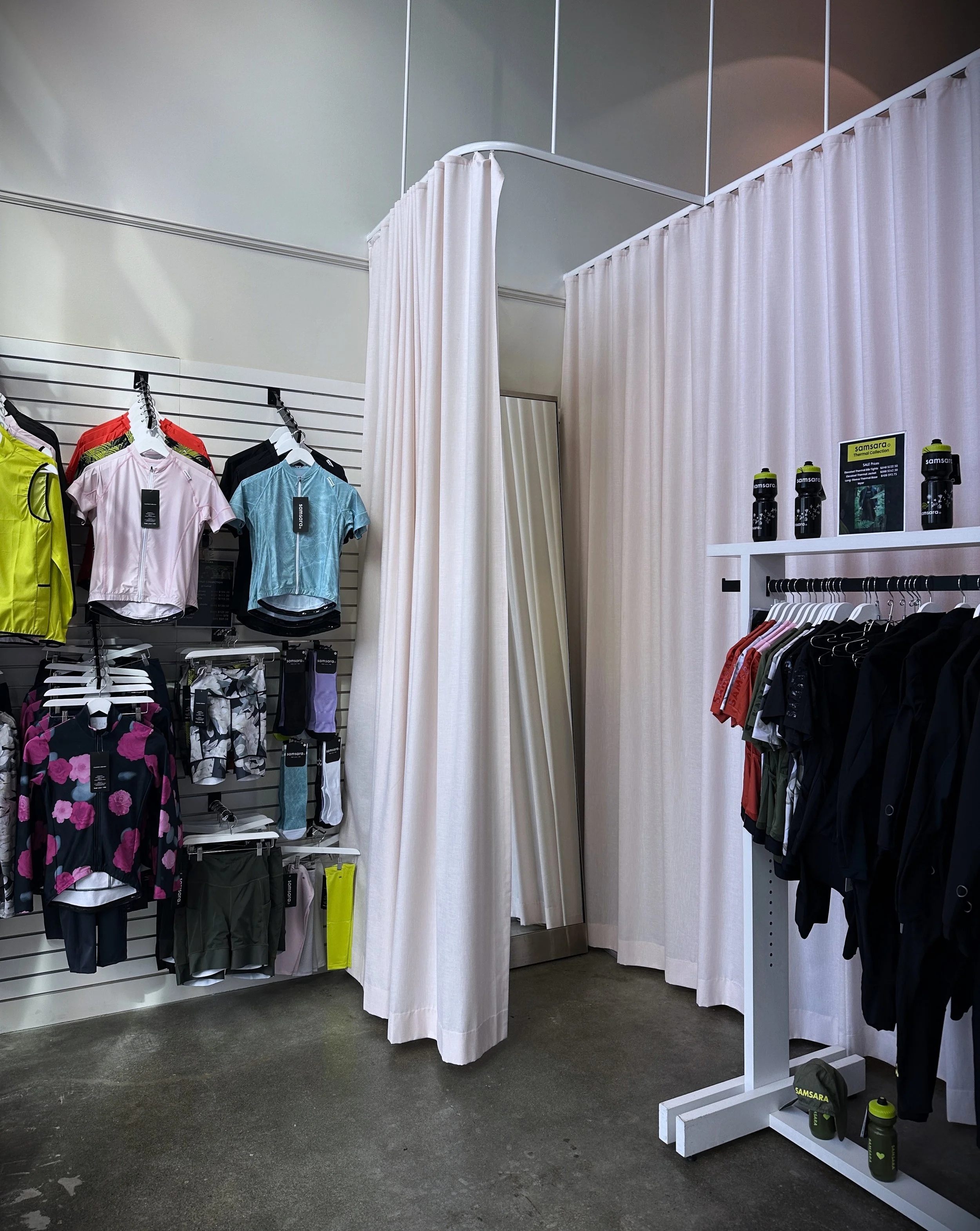 By designing a drapery system to create that separation, it added a soft colourful backdrop to the already vibrant cycling wear on display and the industrial modern materials of the environment.