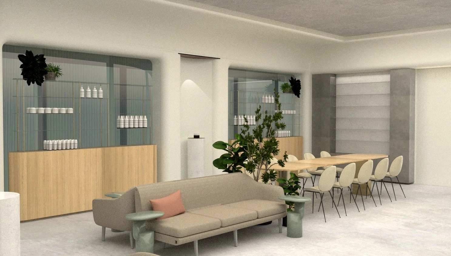 This space leads its company into the future of what medical treatments could feel like. Soft curves, matte finishes, mute palettes and natural references come together to create the design for this local medi spa.