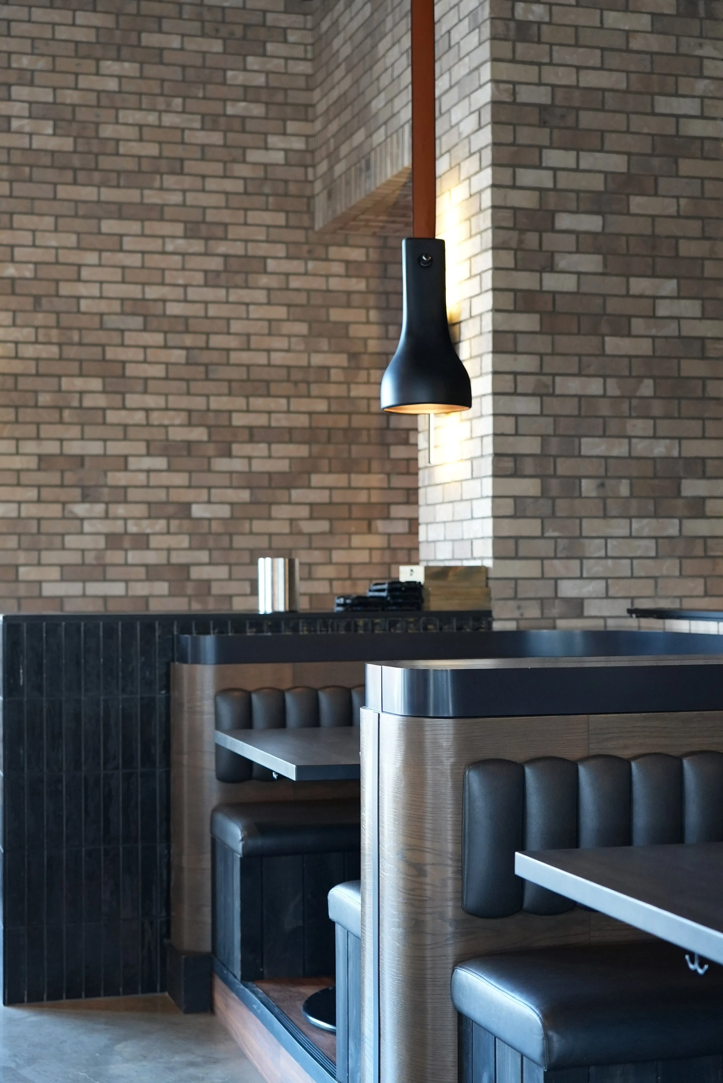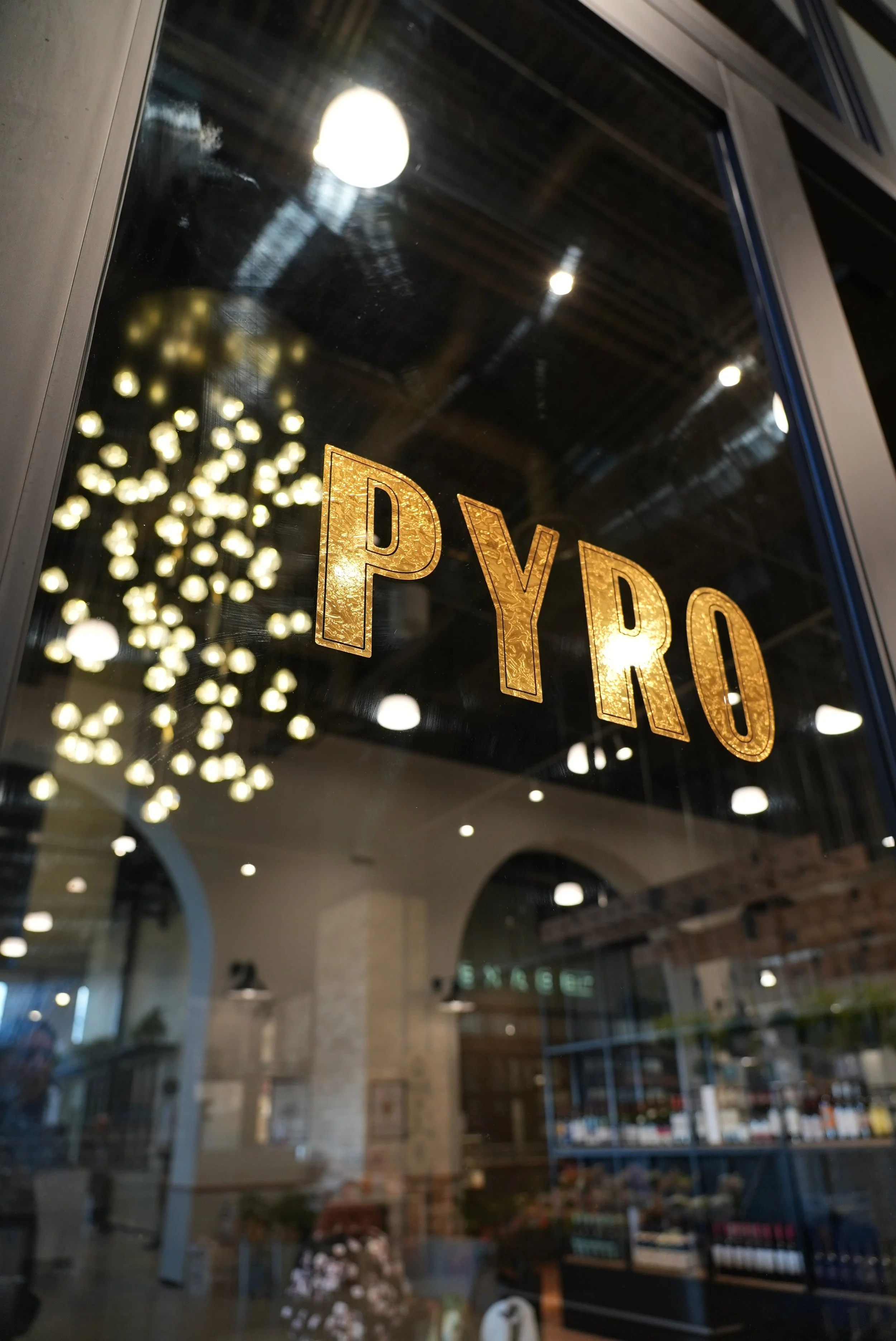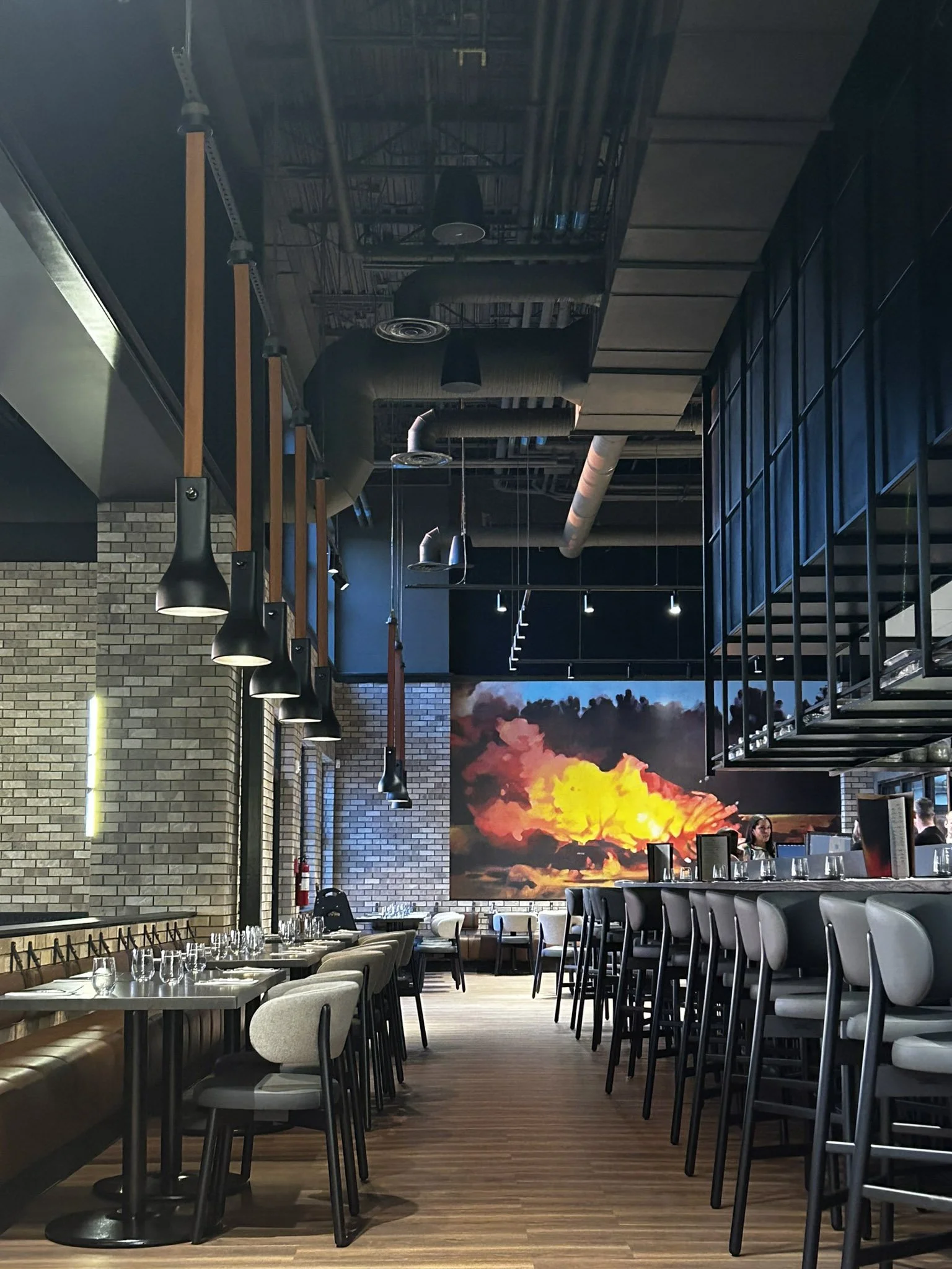 The design of Pyro centers on warm hospitality and the primal essence of cooking over wood fires. Custom light fixtures, hand-pressed from black clay and paired with striking black cauldron-style fixtures suspended by leather straps, evoke the timeless experience of gathering around a fire. Deep, rich-toned furniture mirrors the charred surfaces of wood fires, balancing the warmth and light. Artist Erin Elizabeth Ross's fire-inspired painting serves as a powerful focal point, further unifying the space. Every detail, from the artisanal furnishings to the evocative artwork, was curated to create an atmosphere celebrating the ritual of sharing food and stories around a fire.