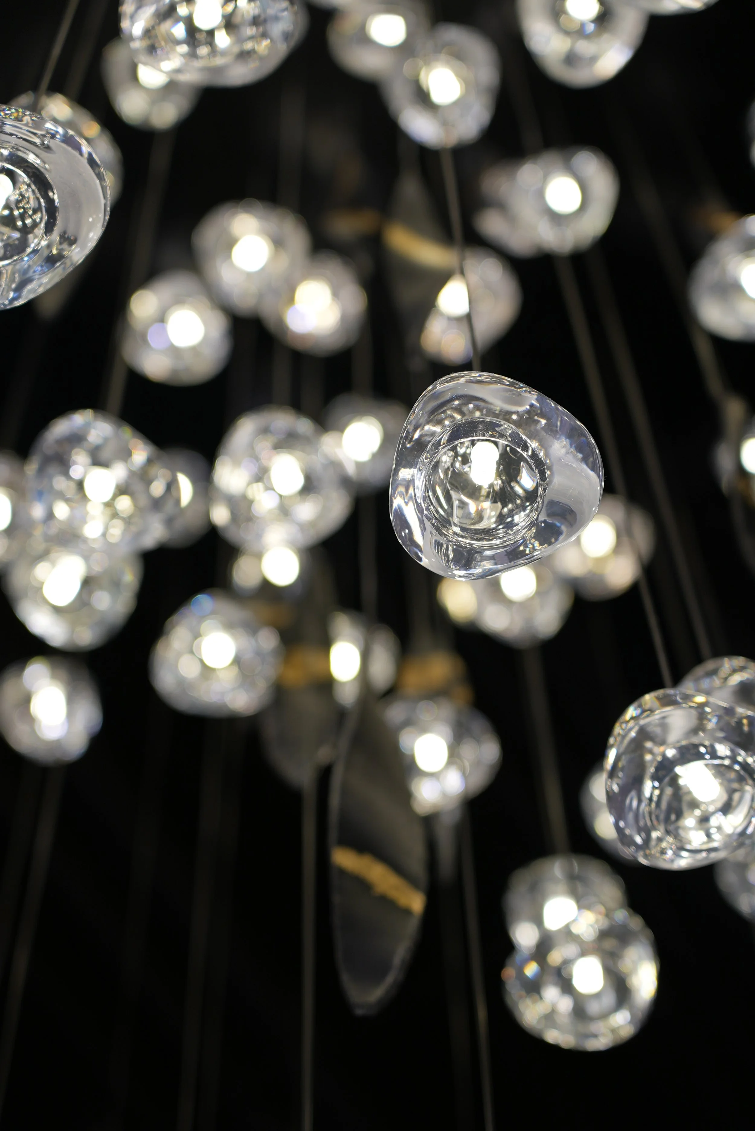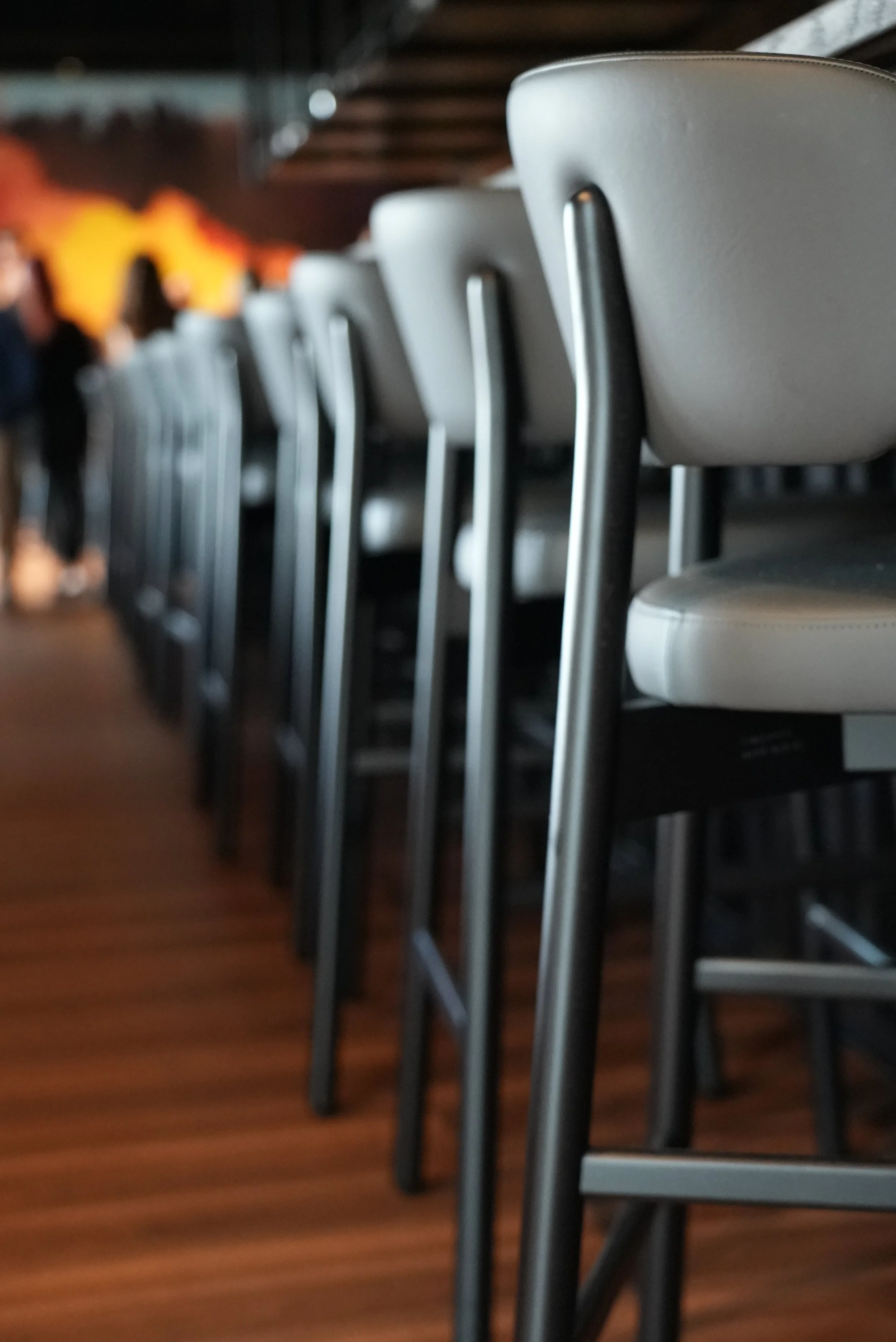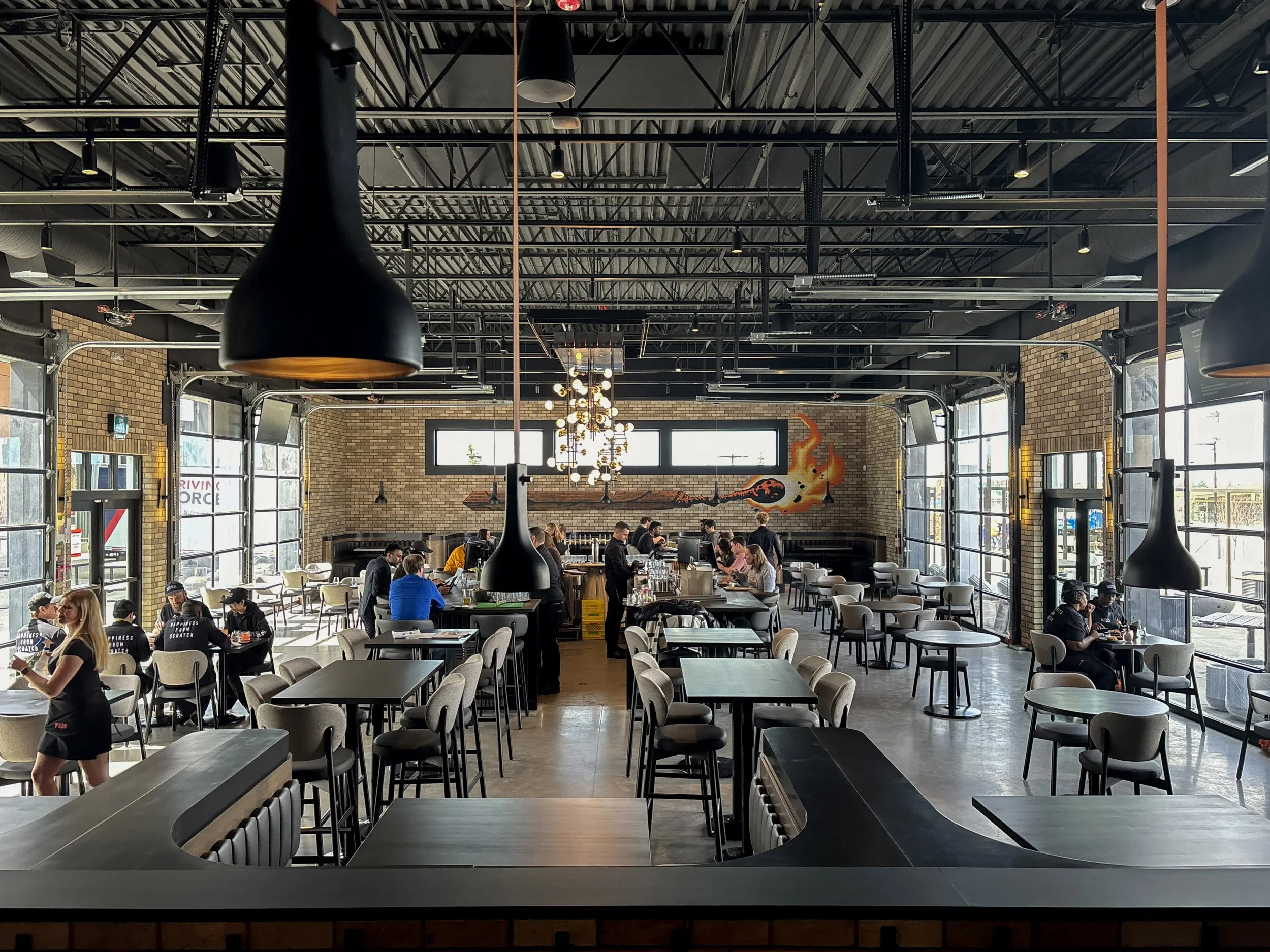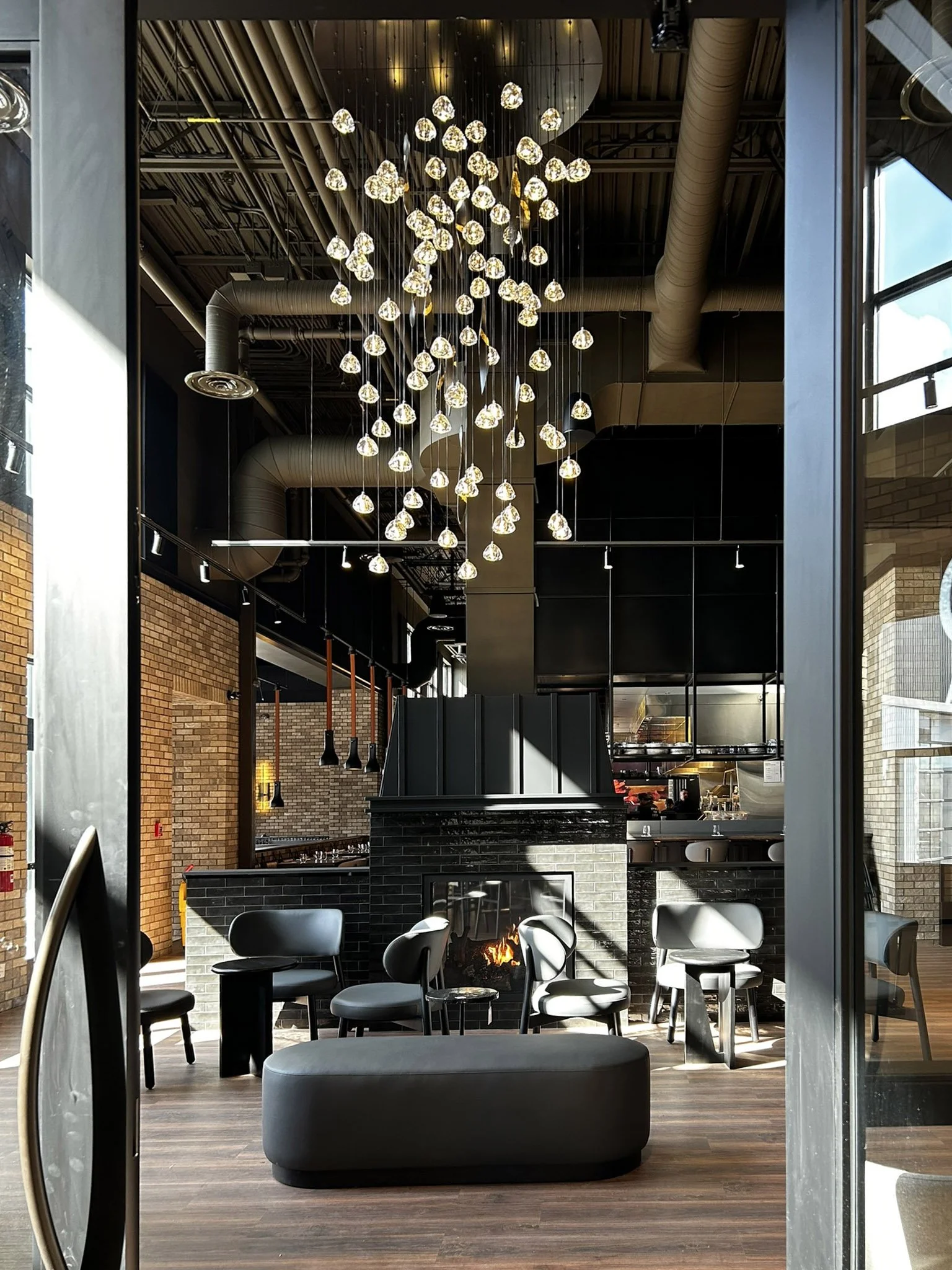 The design of Pyro centers on warm hospitality and the primal essence of cooking over wood fires. Custom light fixtures, hand-pressed from black clay and paired with striking black cauldron-style fixtures suspended by leather straps, evoke the timeless experience of gathering around a fire. Deep, rich-toned furniture mirrors the charred surfaces of wood fires, balancing the warmth and light. Artist Erin Elizabeth Ross's fire-inspired painting serves as a powerful focal point, further unifying the space. Every detail, from the artisanal furnishings to the evocative artwork, was curated to create an atmosphere celebrating the ritual of sharing food and stories around a fire.