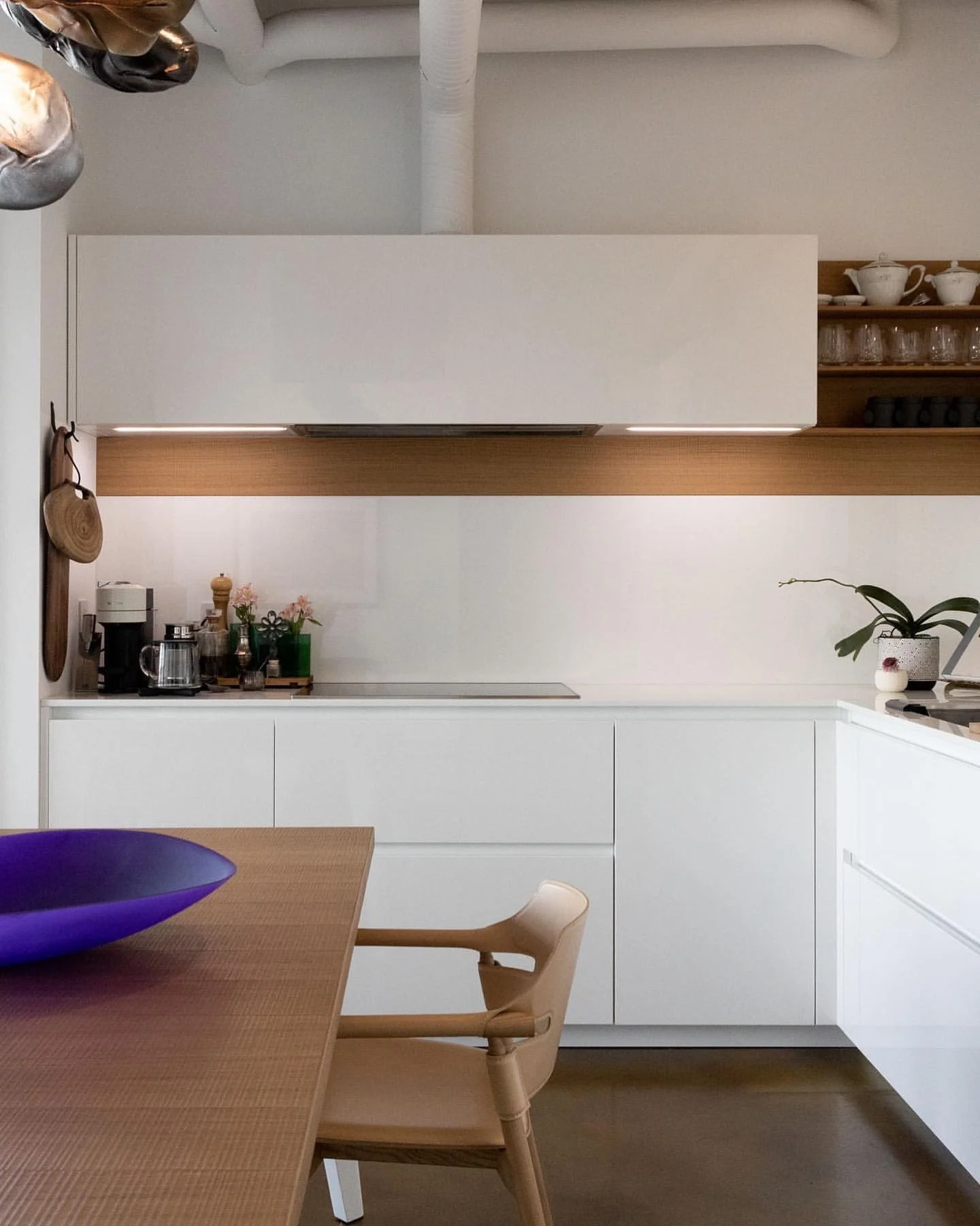 The far right photo depicts the existing kitchen from it’s previous owner. The photo to the left shows the white glossed cabinetry and warm wood open shelving, a captivating and seamless elevation for this incredible loft.