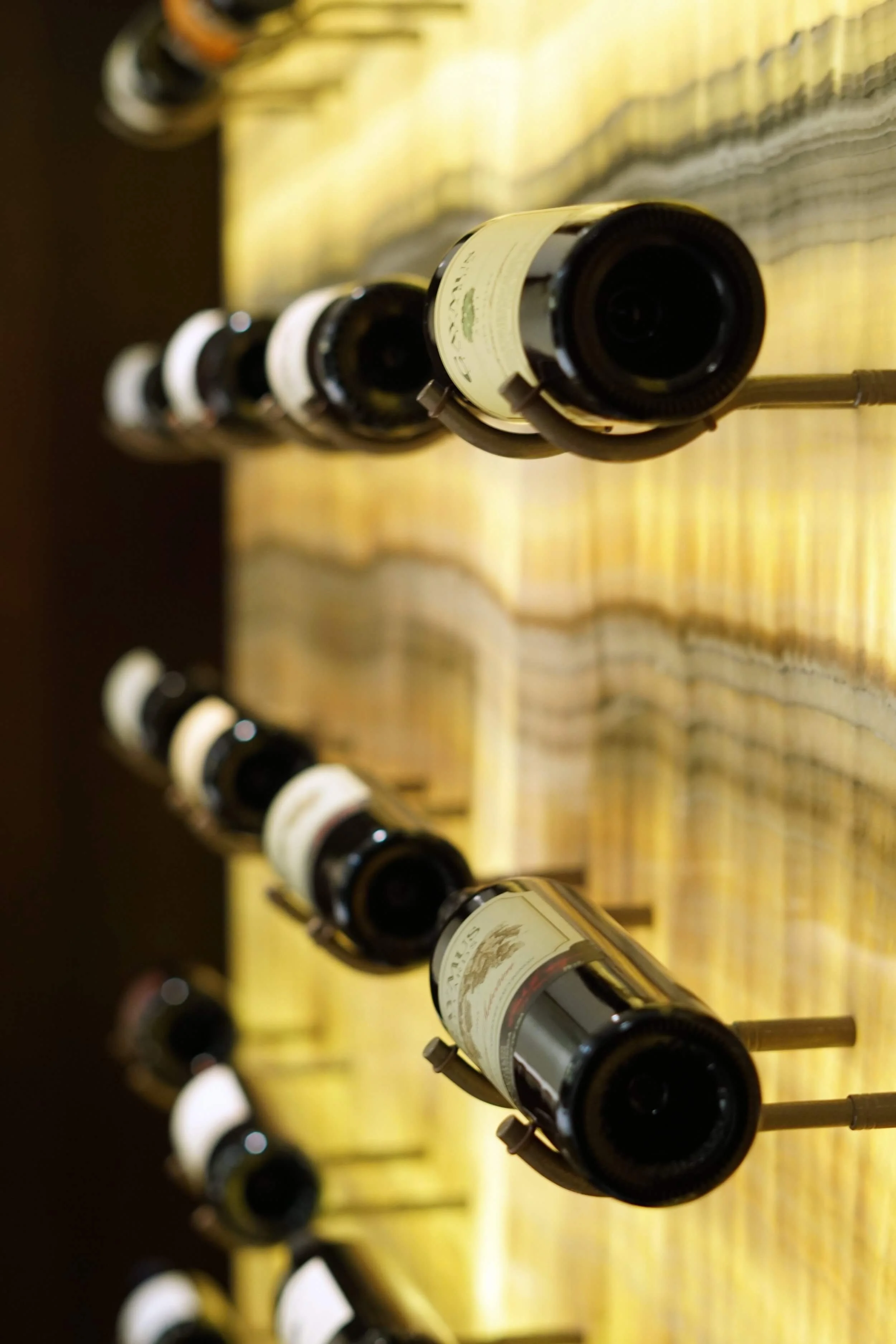 Wine wall display crafted with alabaster similar to that of the custom designed fireplace located in the seating space. Backlit to emit a soft glow that surrounds the bar.