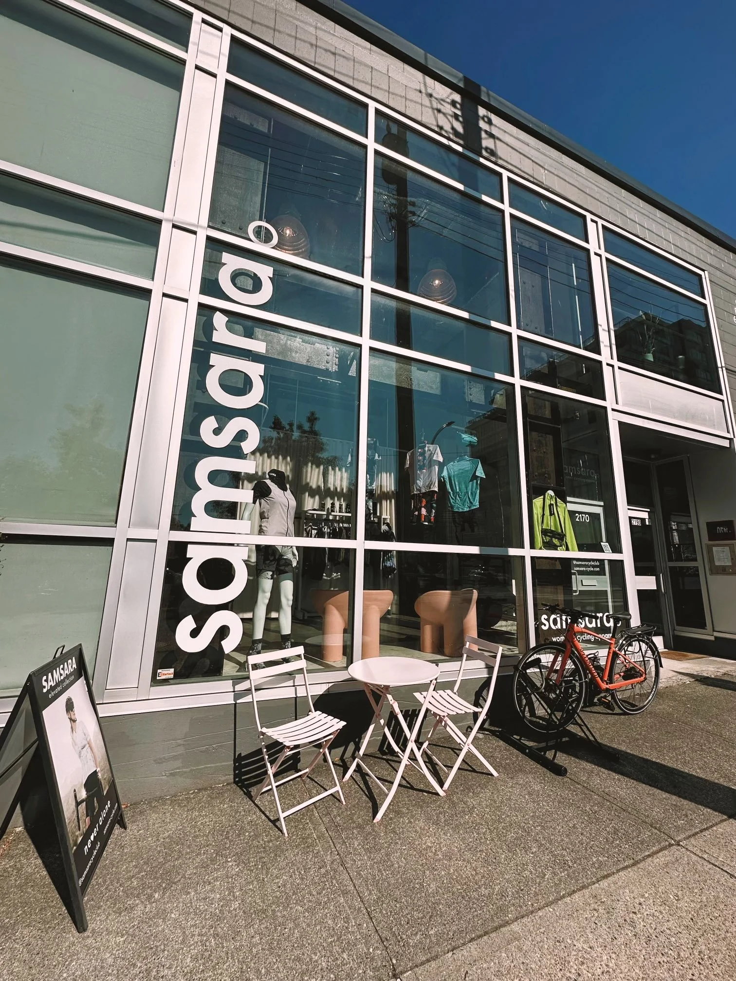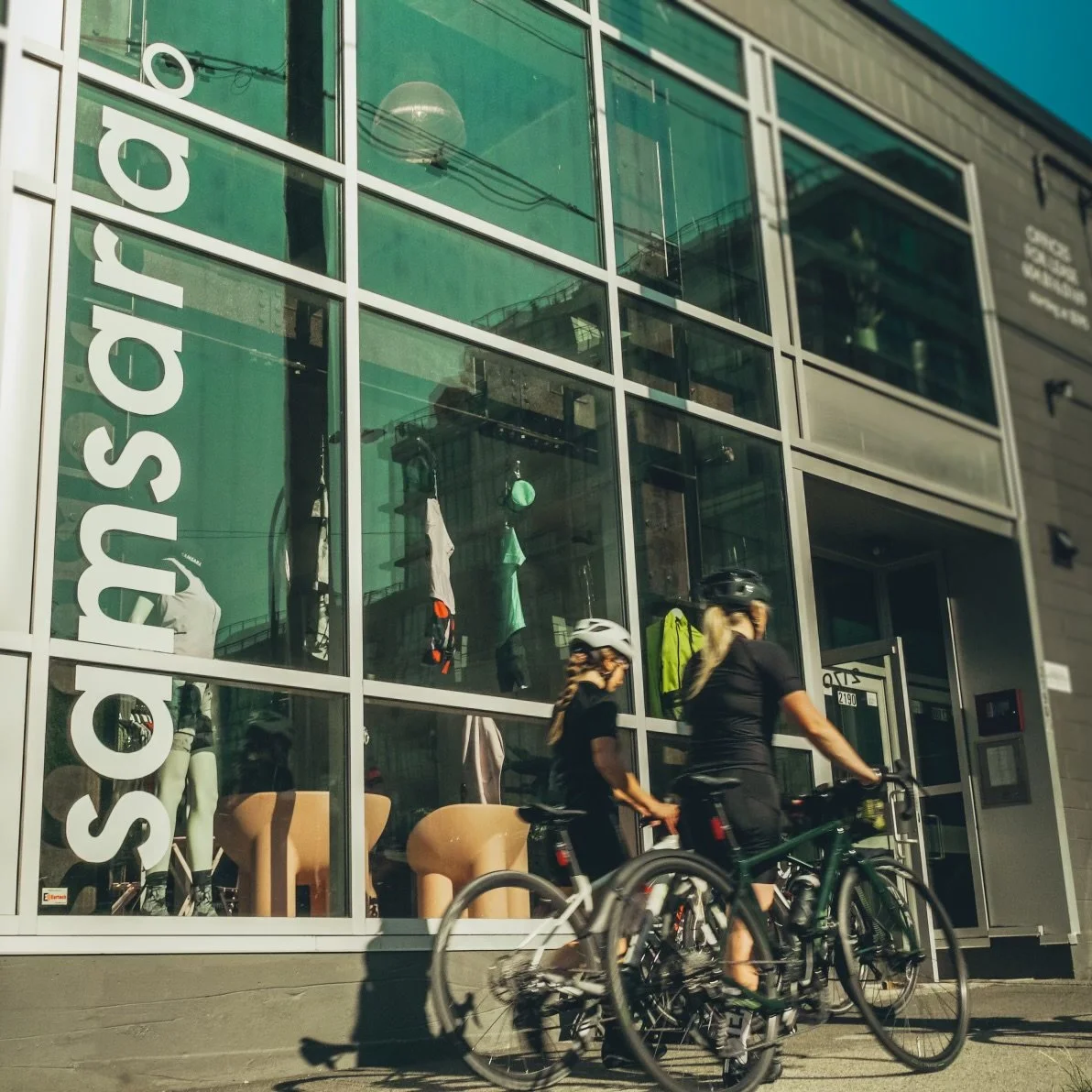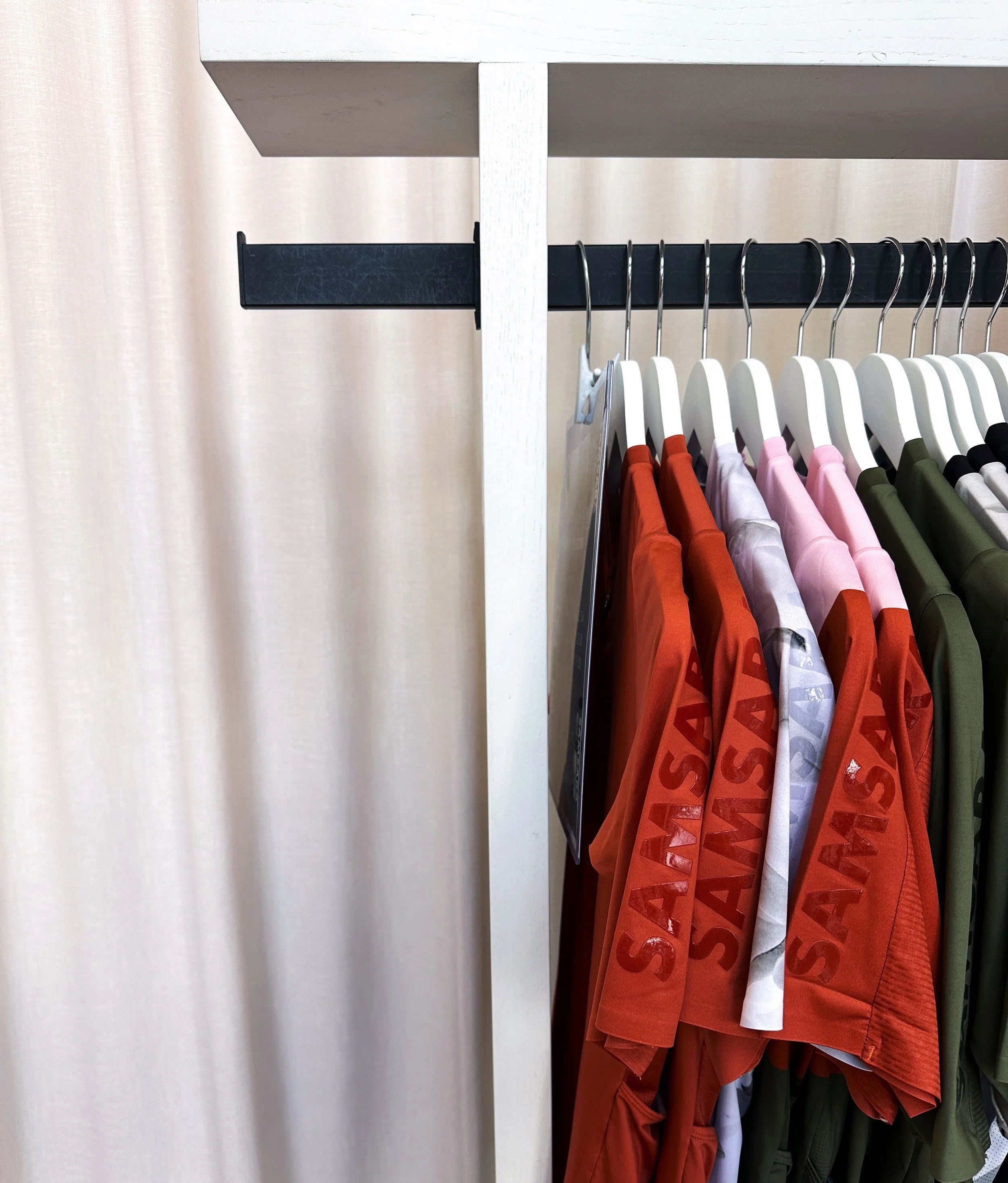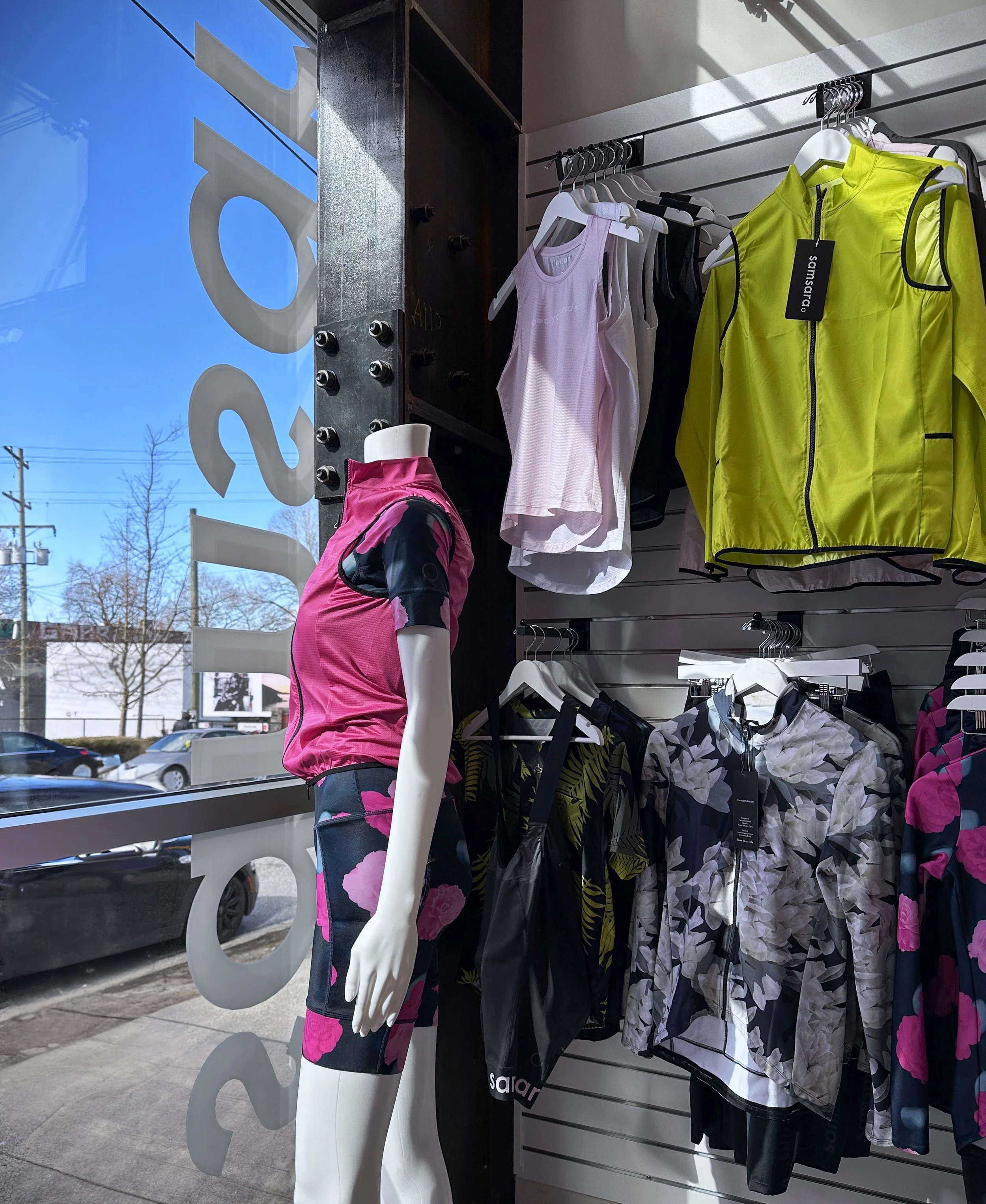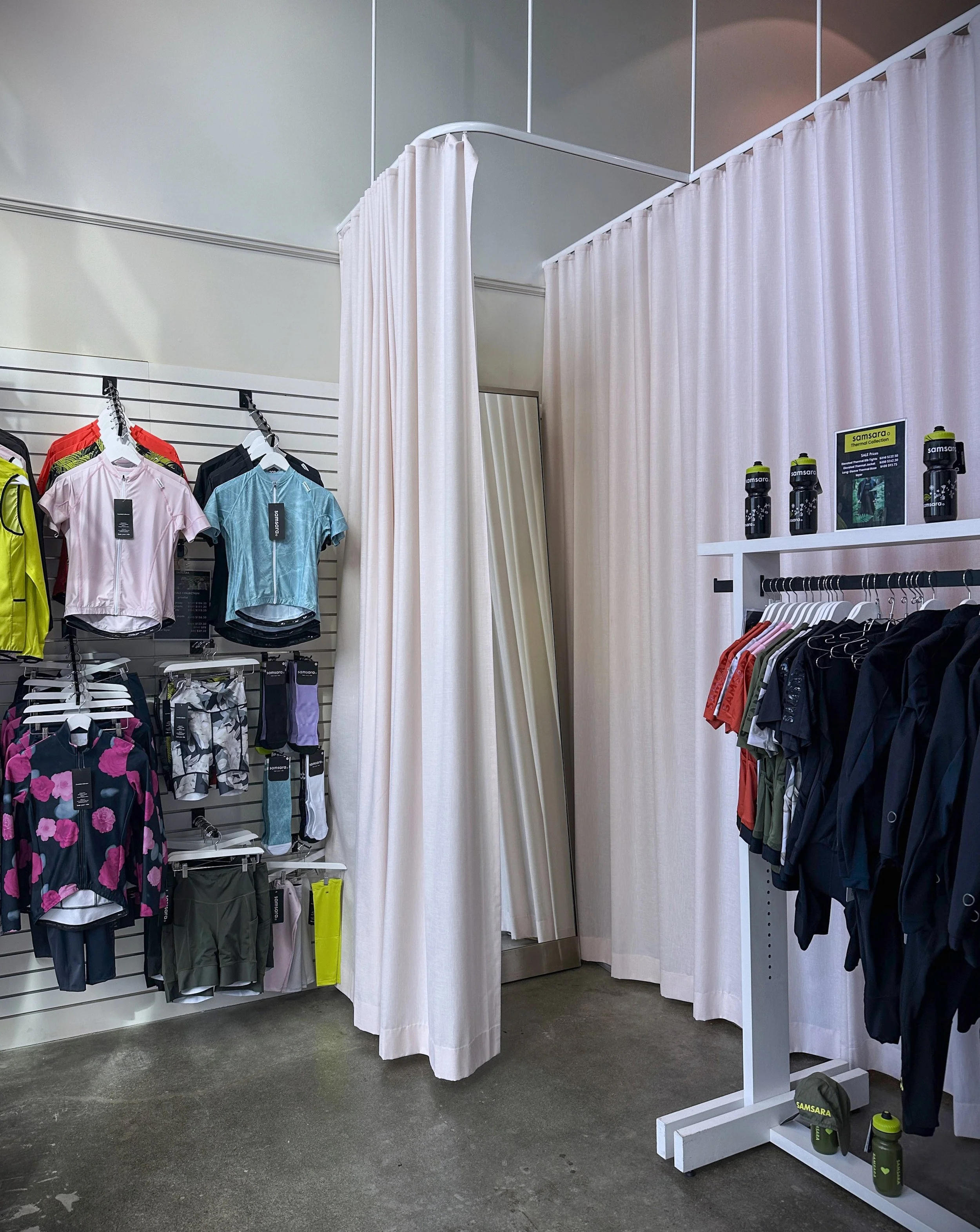 A small square footage space that holds both the creation of premium women’s cycling gear, as well as an office space. By designing a drapery system to create that separation, it added a soft colourful backdrop to the already vibrant cycling wear on display and the industrial modern materials of the environment.
